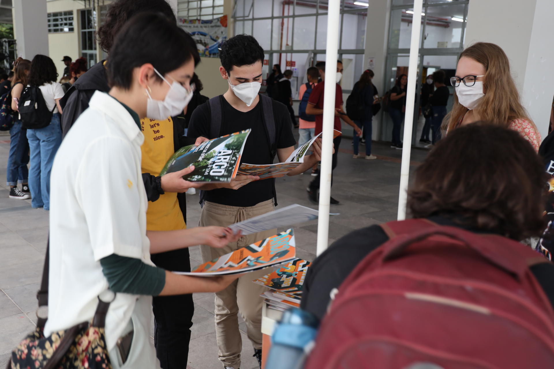 Foto colorida horizontal mostra pessoas ao redor de uma barraquinha, folheando revistas. Todos usam máscaras