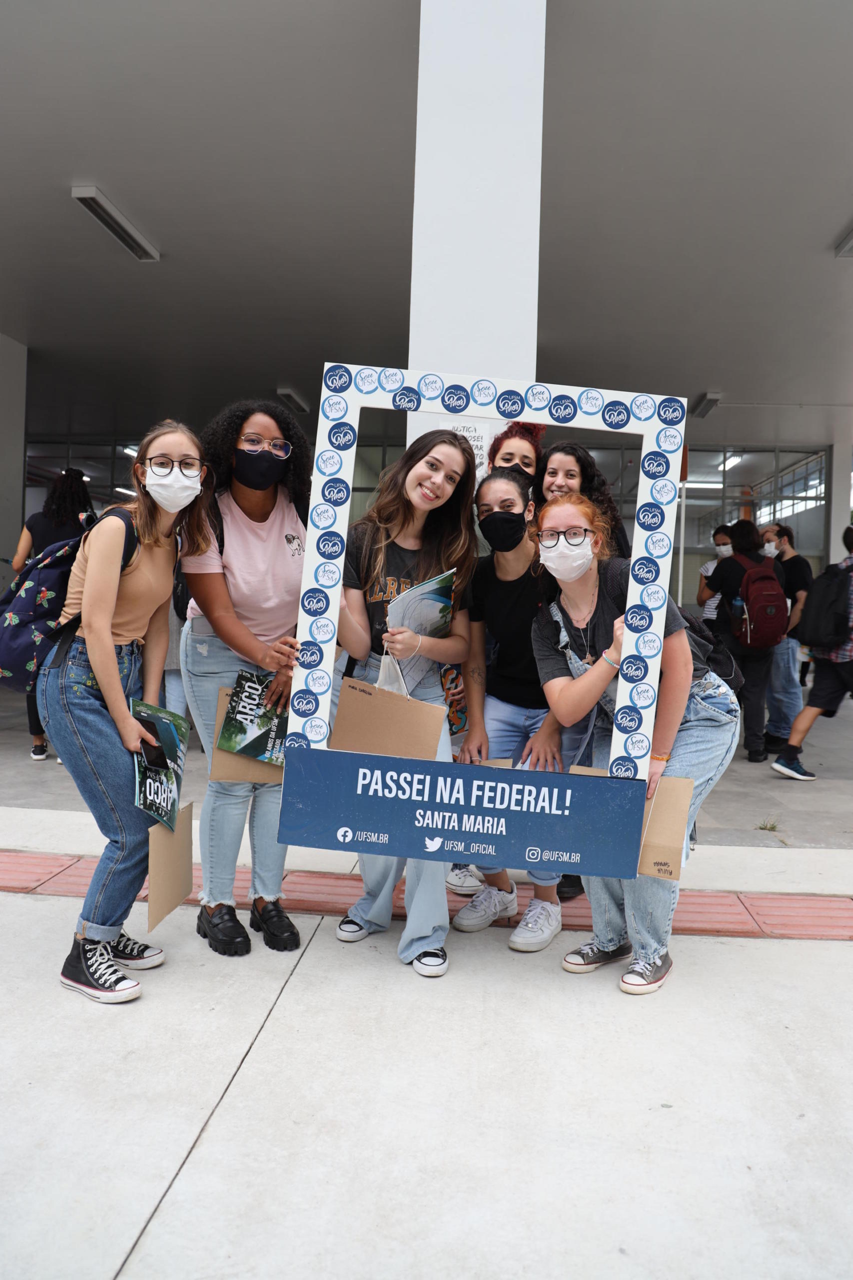 Foto vertical colorida mostra um grupo de sete alunas posando para foto com um quadro vazado ao meio em que está escrito "passei na federal"