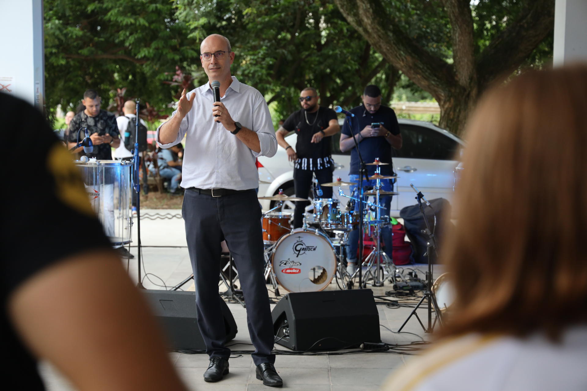 Foto colorida horizontal mostra o reitor, calça preta e camisa branca, falando ao microfone, gesticulando com uma das mãos. Atrás dele integrantes da banda e outras pessoas. Bem à frente na foto, pode-se ver ombros de pessoas que assistiam à fala