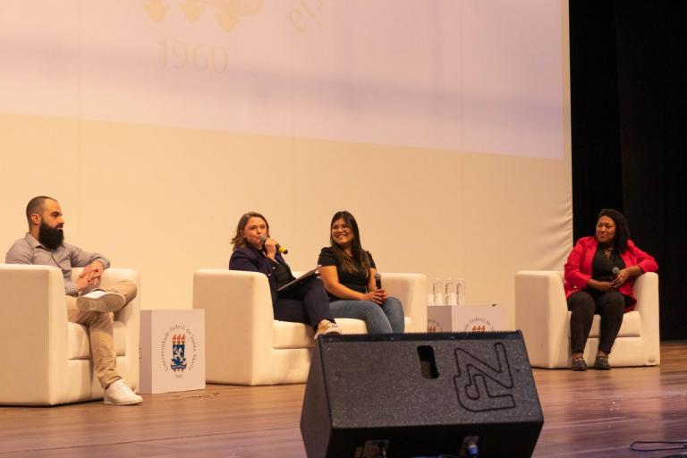 Os convidados iniciaram contando sua relação com a UFSM, o processo de ingresso e a escolha do curso. Beatriz destacou a importância das cotas raciais: “Isso possibilitou o meu ingresso e o de muitas outras pessoas. Foi a realização do meu sonho, que não foi sonhado sozinho, foi um processo também da minha família”, conta. Ainda sobre políticas de acesso ao ensino superior, Larissa afirmou: “A Universidade ter moradia estudantil foi um fator determinante para a escolha da UFSM”.