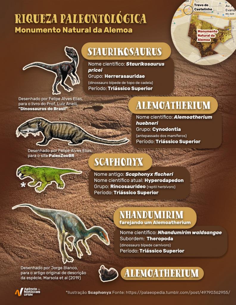 De acordo com o professor Átila da Rosa, pelo menos nove espécies diferentes de fósseis foram identificadas, resultado de centenas de coletas no Monumento Natural da Alemoa. Entre as espécies encontradas estão cinodontes, rincossauros, pseudosúquios, herrerasaurídeos, lagerpetídeos, silessaurídeos e sauropodomorfos.