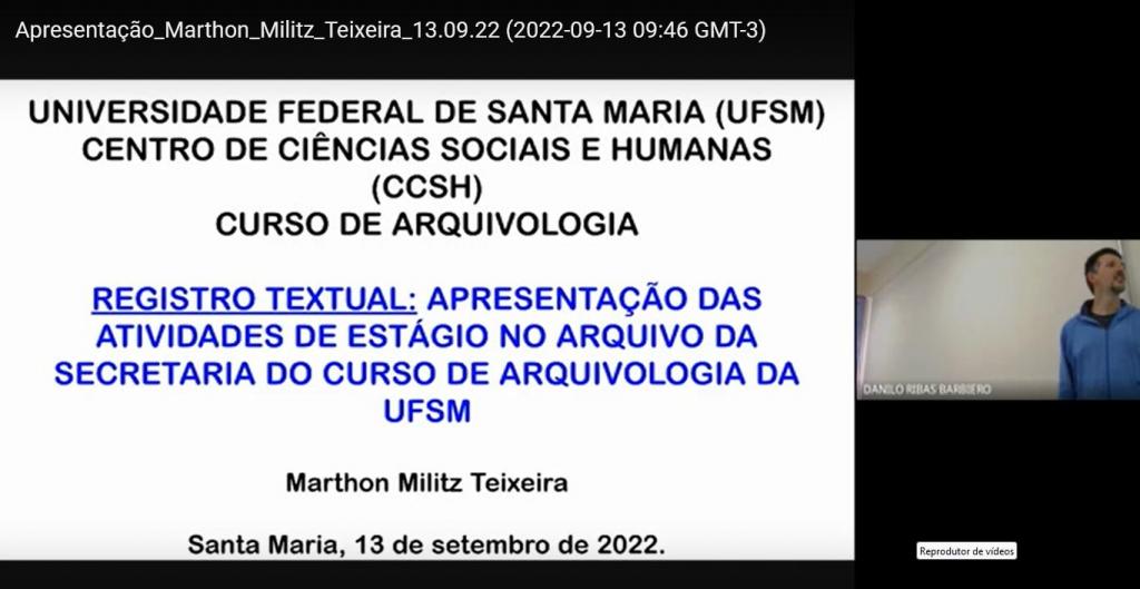 No último dia 13 de setembro, o acadêmico Marthon Militz apresentou as atividades desenvolvidas na disciplina de Estágio Supervisionado em Arquivologia para um grupo de professores e TAES da Universidade Federal de Santa Maria. Marthon concluiu com êxito as atividades de Estágio, que foram devidamente adaptadas às suas condições de deficiência intelectual a partir das orientações do Núcleo de Acessibilidade da UFSM.