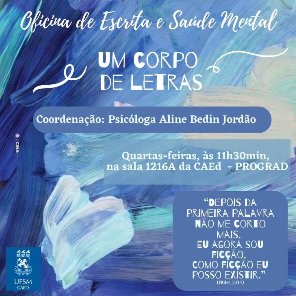 Proposta: Trata-se de um espaço de reflexões/trocas acerca de temáticas que envolvem saúde mental, mais especificamente a relação do sofrimento psíquico com a dimensão do corpo. A partir disso, propõe-se a abertura de tempos e espaços para a produção de escritas com o intuito de nomear as angústias e o mal-estar, bem como produzir uma inscrição de si. Esta ação foi pensada a partir de demandas que envolvem situações de autolesão e automutilação, em que o sujeito se vê invadido por angústias e mazelas afetivas, que transbordam para atos que envolvem cortes corporais, escoriações, lesões e machucados auto infligidos. As oficinas de escrita situam-se como dispositivos de prevenção e promoção à saúde mental, na medida em que possibilitam um endereçamento às questões emocionais que afetam os sujeitos, e que produzem prejuízos e perdas significativas em sua vida, tanto na esfera pessoal quanto social e acadêmica. A escrita organiza o que é da ordem de uma angústia solta, dispersa, desenlaçada. Implica na possibilidade de se dizer, de se contar, de existir. Uma continência e grafia da dor. Produção de letras e palavras que dão bordas e contornos ao indizível.