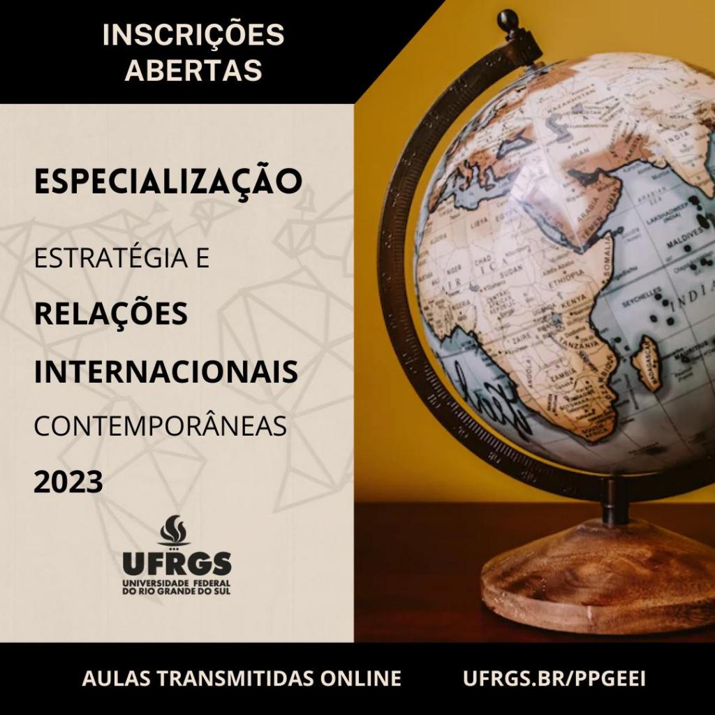 O curso de Especialização em Estratégia e Relações Internacionais Contemporâneas 2023 é promovido pelo Programa de Pós-graduação em Estudos Estratégicos Internacionais (PPGEEI) da UFRGS. Estão abertas, até 15/03, as inscrições. As aulas ocorrerão nas sextas-feiras (noite) e aos sábados (manhã) e poderão ser assistidas presencialmente ou pela transmissão online e síncrona – a critério do(a) aluno(a). As atividades avaliativas também serão oferecidas em plataforma online.