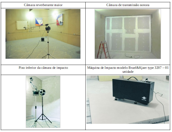 A câmara reverberante maior, de 206 metros cúbicos é usada para ensaios de medição de absorção sonora de materiais (ISO 354), potência sonora de equipamentos domésticos ou máquinas industriais (ISSO 3745), entre outros ensaios que utilizam campo difuso. A figura seguinte demonstra a aplicação de uma fonte de referência de ruído aerodinâmico (Bruel&Kjaer type 4204) e o sistema giratório para microfones (rotate boom) modelo Bruel&Kjaer type 3923. A câmara de transmissão sonora, usada para medir níveis de isolamentos sonoro de paredes de alvenaria (ISO 10140), paredes de gesso ou elementos construtivos da indústria ou da construção civil (portas, janelas, divisórias, etc.). A câmara de impacto é usada para verificar níveis de isolamento de impacto entre pisos superior e inferior. Um exemplo de aplicação da fonte sonora omnidirecional (dodecaedro, modelo Bruel&Kjaer Type 4292-L) e o rotate boom são vistos na Figura seguinte. No piso superior, utiliza-se a máquina de impacto para gerar um nível de ruído de impactação padronizado (ISO 717-2).