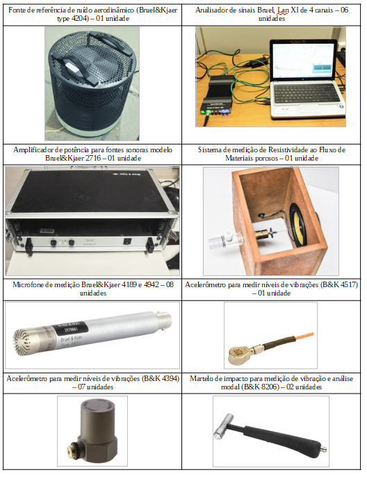 O laboratório de vibrações e acústica também conta fontes de referência, analisadores de sinais, amplificadores de potência, microfones, acelerômetros e martelos de impacto. A figura abaixo apresenta alguns dos principais equipamentos, marca e modelo.