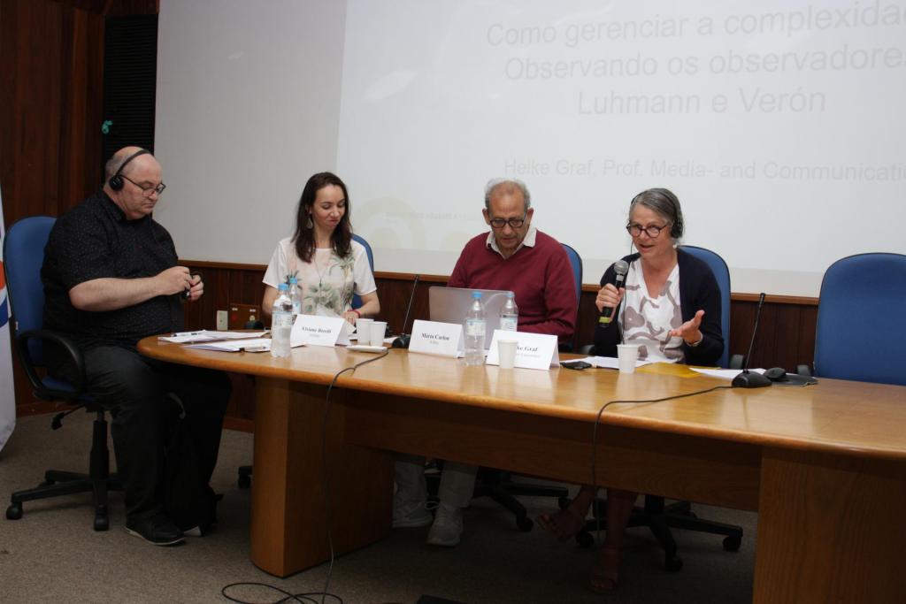 Na sequência, iniciando a primeira mesa de debate do evento, Heike Graf apresentou sua perspectiva sobre a temática “Como gerenciar a complexidade? Observando os observadores, Luhmann e Verón” e Mário Carlon sobre a “Transformação contemporânea da rede semiótica”. Já Antonio Fausto Neto trouxe para a discussão o tema “Entre plataformas e hipermidiatização : sentidos em circulação dos papéis efêmeros”. Por sua vez, Viviane Borelli expôs sua pesquisa sobre “A problematização teórica-metodológica nos estudos de circulação e plataformas”.