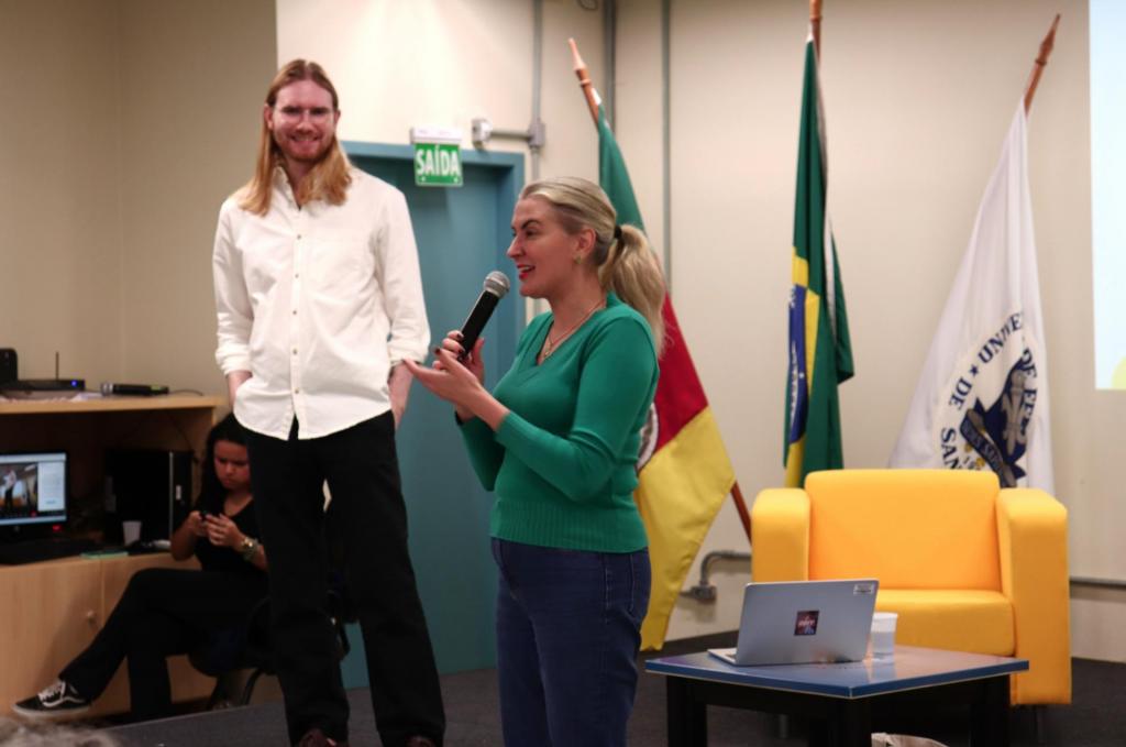 O doutorando polonês Mateusz Miesiac, pesquisador da Universidade Södertörn (Suécia), apresentou na última terça-feira, 8 de abril de 2025, sua investigação sobre narrativas autobiográficas digitais de homens bi+. O evento, realizado no Auditório do Prédio 74C da Universidade Federal de Santa Maria (UFSM), foi promovido em conjunto pelo Programa de Pós-Graduação em Comunicação (Poscom) e pelo PET-Comunicação Social da instituição. A mediação foi realizada pela professora coordenadora Aline Dalmolin.