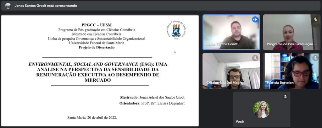 O Programa de Pós-Graduação em Ciências Contábeis da UFSM realizou na data de 20 de abril de 2022 a banca de defesa de projeto de dissertação do mestrando Jonas Adriel dos Santos Grodt, da Linha de Pesquisa em Governança e Sustentabilidade Organizacional. Trata-se da 4ª banca de qualificação de dissertação realizada no Programa.