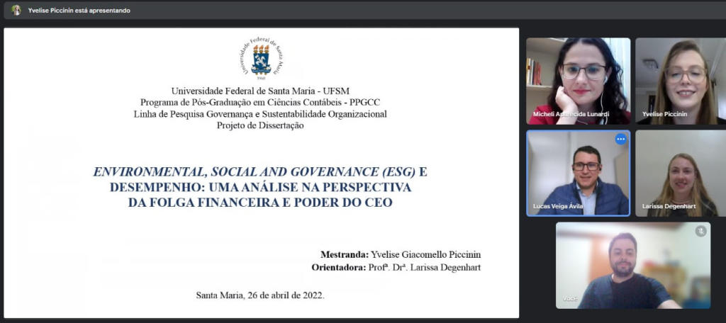 O projeto intitulado “Environmental, Social and Governance (ESG) e desempenho: uma análise na perspectiva da folga financeira e poder do CEO” de autoria da mestranda Yvelise Giacomello Piccinin foi apreciado pela comissão examinadora composta pelos docentes: Larissa Degenhart, orientadora e presidente, Lucas Veiga Ávila, membro interno do PPGCC/UFSM, e Micheli Aparecida Lunardi, membro externo vinculado ao Programa de Pós-graduação em Ciências Contábeis da Universidade Regional de Blumenau.