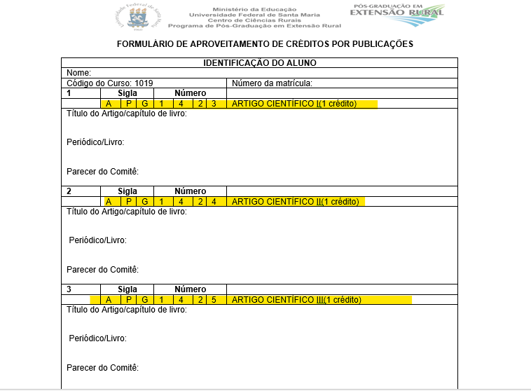 1) Requerimento de dispensa ou aproveitamento de disciplinas de mestrado/doutorado, aproveitamento de créditos por publicação ou teste de proficiência. Documento disponível clicando https://www.ufsm.br/cursos/pos-graduacao/santa-maria/ppgexr/formularios-aproveitamento-de-creditos/.