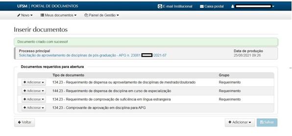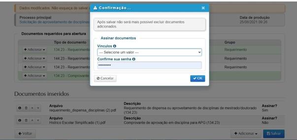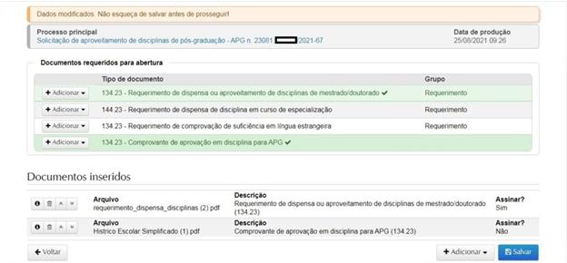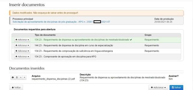 Clicando em “salvar”, o (a) discente terá acesso ao número do processo (sempre iniciando com 23081). É importante guardar este número para consulta. Nesta página o (a) discente deverá inserir os documentos obrigatórios em formato pdf: