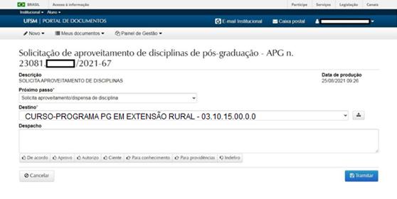 Nesta página, as informações já são preenchidas automaticamente, sendo o campo “despacho” de preenchimento opcional. O (a) discente deverá clicar em “tramitar”.