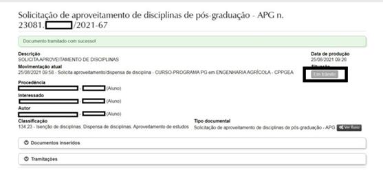 Na próxima tela o (a) discente tem acesso ao resumo do processo. Clicando em “documentos inseridos”, o (a) discente poderá conferir se anexou os documentos corretos. Estando tudo correto, o (a) discente deverá clicar em “tramitar”.