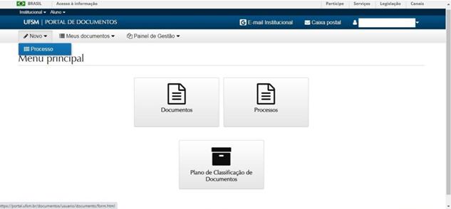 Ao acessar o Portal de Documentos, o (a) discente deverá clicar em “novo” e em seguida em “processo”.