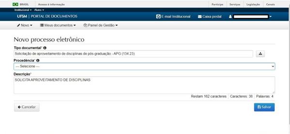 Após selecionar esta opção, o campo procedência será preenchido automaticamente, caso o (a) discente tenha apenas uma matrícula na UFSM. Caso o (a) discente tenha mais de uma matrícula, deverá selecionar a matrícula correspondente ao PPGExR. O campo “descrição” pode permanecer como está e o próximo passo é clicar em “salvar”.