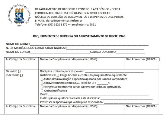Caso o (a) discente esteja pedindo aproveitamento de alguma disciplina da UFSM que tenha mudado de código ou que tenha sido extinta, nos campos “código da disciplina” e “nome da disciplina” deverão constar as informações da nova disciplina. No campo “disciplina utilizada para dispensar” deverá constar o código e o nome disciplina antiga.