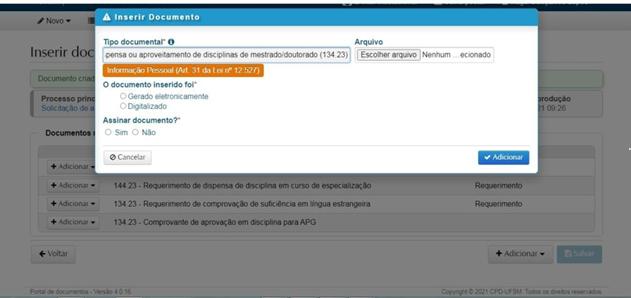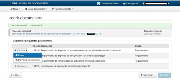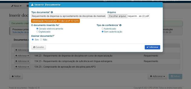 Clicar em “adicionar “e sem seguida clicar em “enviar”. Abrirá uma janela para anexar o “Requerimento de dispensa ou aproveitamento de disciplinas de mestrado/doutorado”.