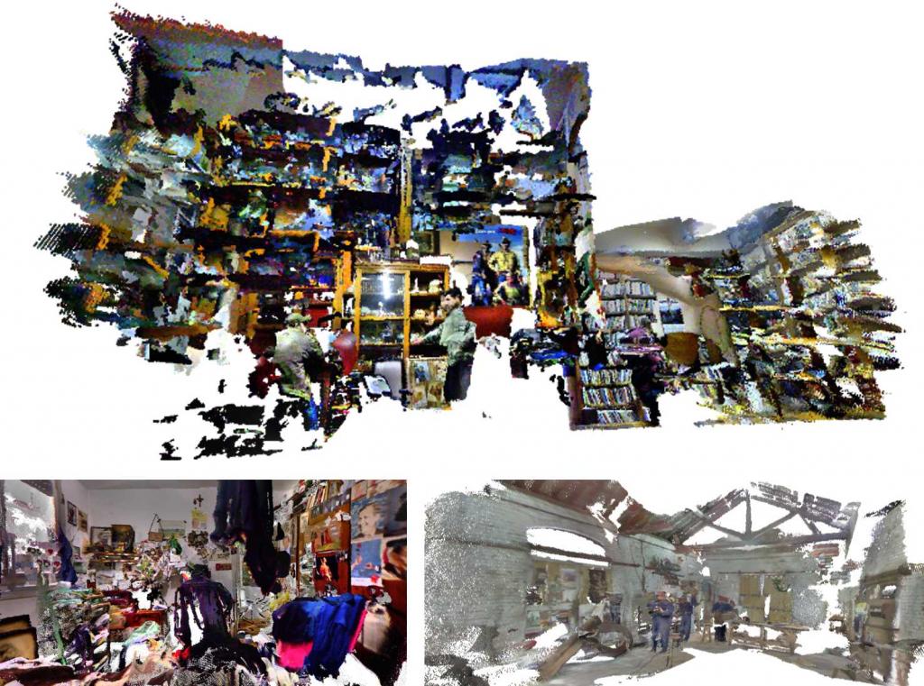 Frames da “nuvem de pontos” de Transhabitat. A partir de escaneamento em 3D do Sebo Café, apartamento de JJAC e da antiga Gare da VFRGS, Santa Maria.