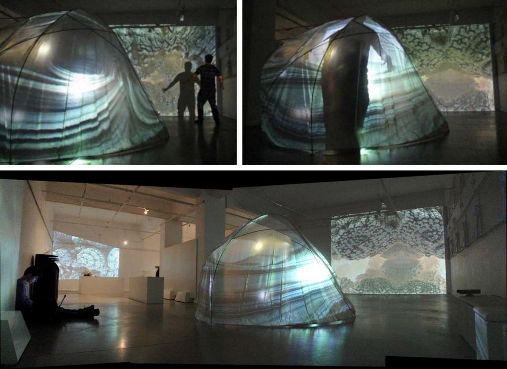 Registros fotográficos da interação de Tiago Teles e Heloísa Gravina, e do autor com o grafo topológico de Transhabitat, de Matheus Moreno. Exposição Arte.Interatividade.Tecnologia – LabInter, 2015. Na sala Cláudio Carriconde (CAL/UFSM).