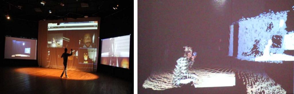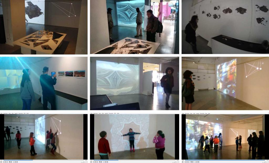 Registros fotográficos de Intermitências Zerodimensionai (performance telemática da Rede LATI) com projeção interativa, de Matheus Moreno. 24° Encontro da ANPAP, 2015 em Santa Maria RS. Na Exposição Laboratórios de Arte e Tecnologia PPGArt. Teatro Caixa Preta (CAL/UFSM).