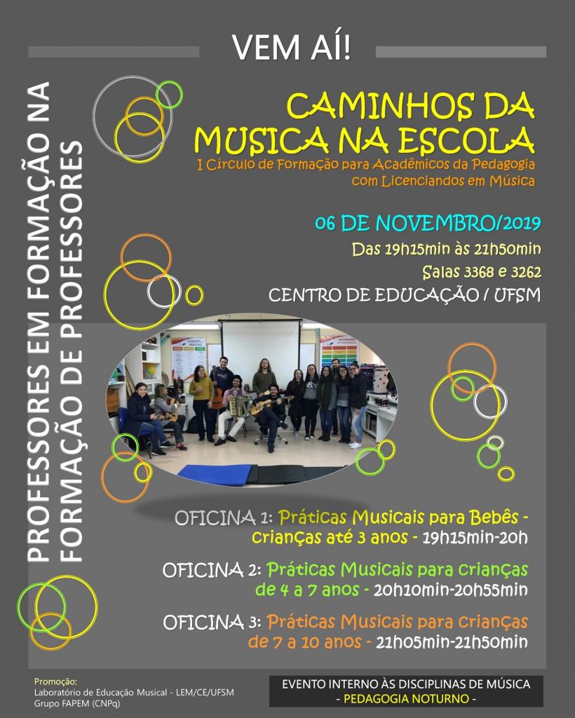 Círculos formativos em Música: formação de professores e práticas musicais, vinculado ao Laboratório de Educação Musical – LEM/CE, se constitui em um projeto de ensino e extensão englobando as áreas de Música e Educação, o qual incide diretamente na formação de professores, acadêmicos e comunidades escolares e não-escolares. As ações idealizadas constituem propostas que integram professores e acadêmicos dos cursos de Música – Licenciatura e Bacharelado, Pedagogia, Educação Especial e a comunidade de Santa Maria, com repercussões para diferentes públicos e contextos. O projeto congrega ações independentes que se articulam e complementam em torno da educação musical, organizando-se em três linhas, (a) formação musical e pedagógico-musical de professores em serviço e futuros docentes, (b) formação musical e pedagógico-musical de licenciandos; e (c) concertos didáticos. Como projeto vinculado ao LEM/CE, as propostas vêm intensificar e diversificar as ações de formação desenvolvidas nesse espaço, com a oferta de formação continuada para profissionais da educação básica, bem como de formação complementar para acadêmicos. Além disso, o projeto oferece formação musical a comunidades escolares e não-escolares de Santa Maria e região a partir de concertos didáticos. Salienta-se que projetos dessa natureza, realizados em parceria entre Universidade e escolas, são de relevância para o sistema educativo, tendo em vista a troca de saberes que decorrem do processo. Por fim, ações voltadas à música nas escolas são pertinentes no atual momento, tendo em vista o pós-pandemia, a necessidade de uma formação em Arte, a implementação da Lei 13.278/2016, que inclui a música juntamente com as demais linguagens artísticas nos currículos dos diversos níveis da educação básica, bem como do Documento Orientador Municipal – DOM (2019). Neste sentido, o projeto vem impactar positivamente na comunidade, contribuindo com a implementação de políticas na área de Arte e para a promoção de espaços voltados à formação, reflexão, trocas e aprendizagens através de oficinas, seminários, encontros, palestras e concertos.