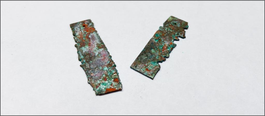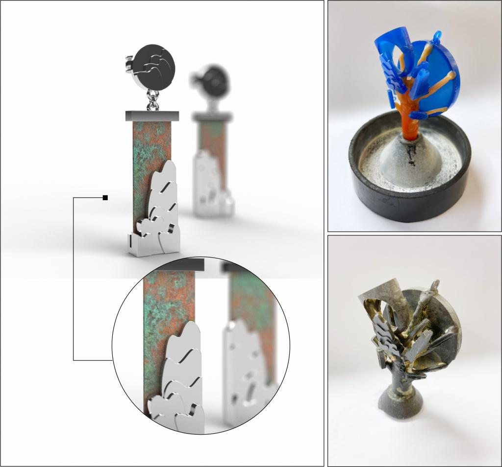 O cobre obtido foi pesado e passou pelo processo de fundição e laminação, para a criação de chapas. Com as chapas fabricadas, passou-se para o processo de oxidação, onde foram utilizados sal, água e vinagre. Logo após o processo de oxidação obtido, com as chapas de cobre bem “esverdeadas”, passou-se para o processo criativo para o desenvolvimento das peças, inspirando-se em texturas e movimentos da natureza. Após, as joias criadas foram modeladas em software 3D, e um brinco foi escolhido e fabricado em prata e cobre oxidado. O projeto encontra-se em andamento com publicações previstas para 2024/2025.