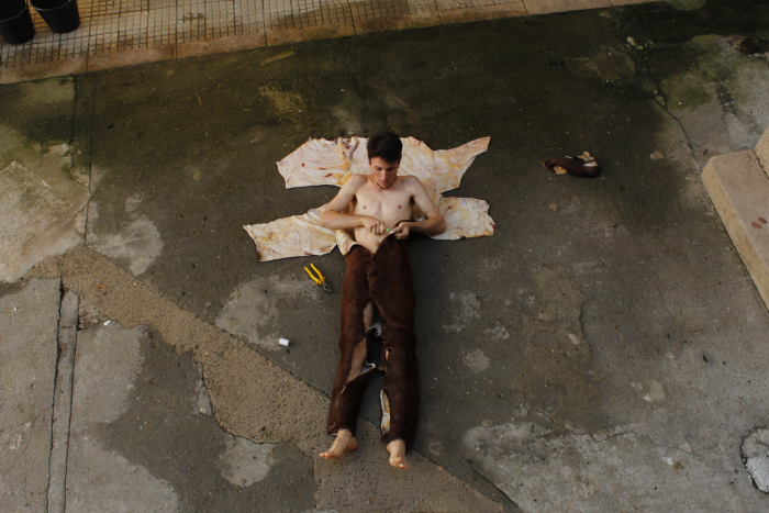 Mateus: Dentre as inúmeras referências que utilizo estão artistas da performance como Oleg Kulik, Rodrigo Braga e a artista sérvia Marina Abramović. Também encontro respaldo em alguns teóricos como Andreas Lommel e Mike Williams em suas discussões sobre a arte primitiva, o animal e o xamanismo; Bataille e Agamben em seus ensaios sobre o animal; bem como Bachelard (noturno) em suas sábias palavras sobre a imaginação.