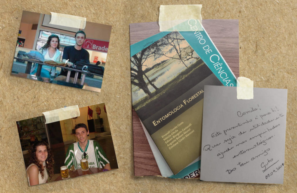 Ela lembra que dia de coleta era dia de acordar cedo, passar no laboratório e pegar os materiais: “A gente ia caminhando, fazia todo o percurso a pé, conversando, trocando ideias, enfim, era divertido”. Nos fragmentos de vegetação, as armadilhas eram instaladas, o material era recolhido, e o líquido, substituído. “Como tinha [que ir armando] armadilha por armadilha, a gente ficava até a metade da tarde, então sempre tinha que levar lanche, sanduíche, em determinadas épocas a gente colhia amoras pra comer e assim a gente ia conversando e passava boa parte do tempo juntos”. Camila conta que faziam questão de levar lanche e montar um piquenique no meio da floresta: “nada muito elaborado, mas pra gente tirar um tempinho em contato com a natureza”. Emocionada, Camila lembra que tem fotos suas que foram tiradas por Augusto durante as coletas, dela comendo amoras. “Como ele era muito tecnológico, naquela época era um dos poucos que tinha câmera digital e aí ele tirava as fotos, né? Era a visão do Augusto sobre mim, ali, de alguma forma”, conta.