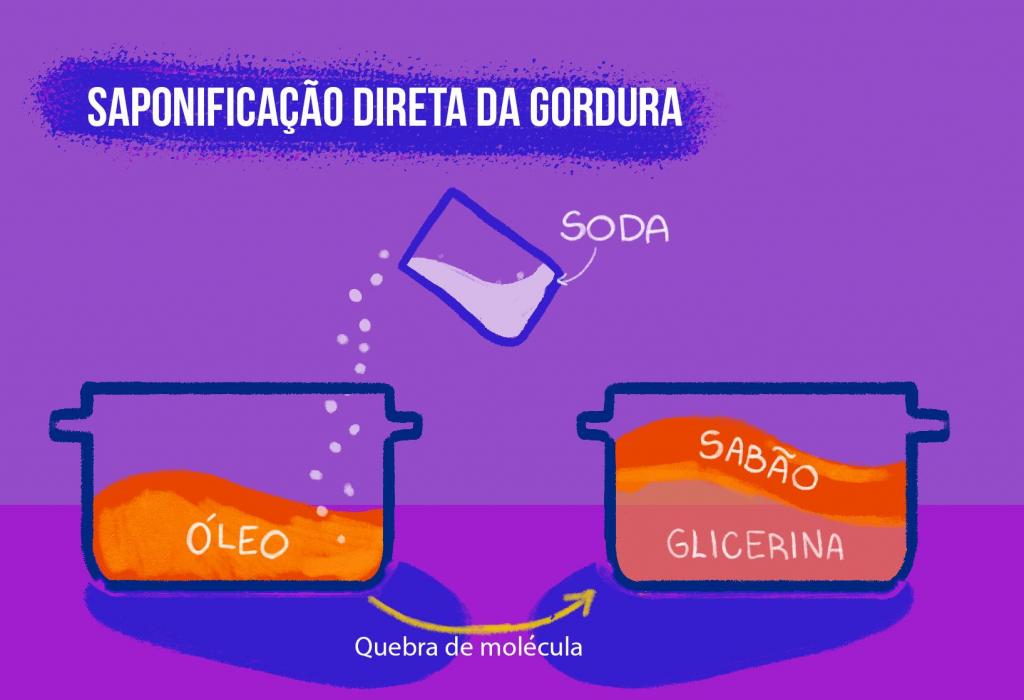 Na prática, durante a produção do sabão acontece um processo chamado saponificação direta da gordura. Para que isso ocorra, primeiro é necessário hidrolisar a gordura, ou seja, quebrar as moléculas, por isso o óleo é misturado com a soda cáustica. Com essa ação, ocorre de forma natural a separação do glicerol e de um material que está pronto para virar sabão. Isso é possível porque uma parte da molécula de gordura reage com o hidróxido de sódio (soda cáustica), que quebra e forma outra molécula.