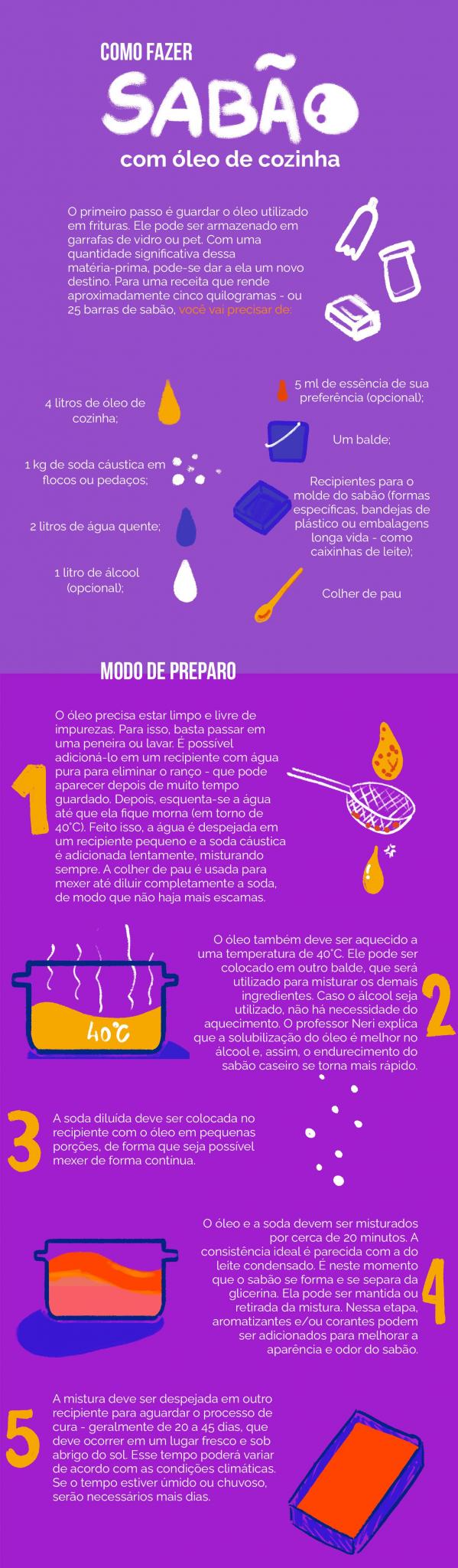 O processo para fazer sabão obedece uma regra básica: uma reação entre um ácido graxo (gorduras e óleos de origem vegetal ou animal) com um material alcalino – de caráter básico, como a soda cáustica. O óleo de soja, utilizado na cozinha, é um exemplo de ácido graxo que pode ser reutilizado para a fabricação de sabão. Essa forma de reutilização também contribui com o meio ambiente. Se não for descartado corretamente, o óleo pode entupir tubulações e poluir a água. Isso ocorre porque o óleo de cozinha é uma mistura de substâncias que não se dissolvem na água. Ele é apolar, e a água, polar, o que significa que são substâncias opostas. Assim, sempre que essa gordura entra em contato com a água, eles ficam separados em virtude da diferença de densidade. Segundo dados da Associação Brasileira da Indústria de Óleos Vegetais (Abiove), os brasileiros descartam, na natureza, cerca de um bilhão de litros de óleo de forma incorreta.