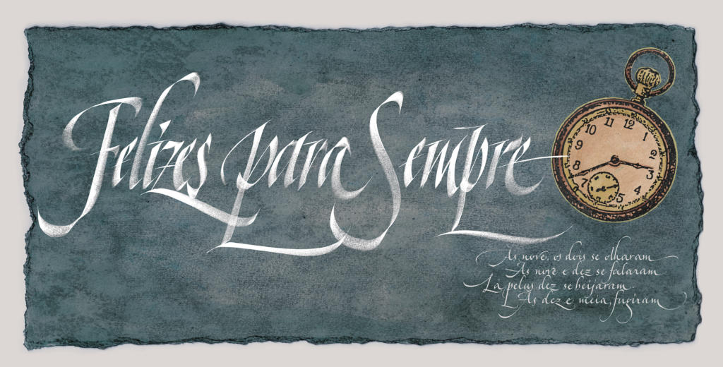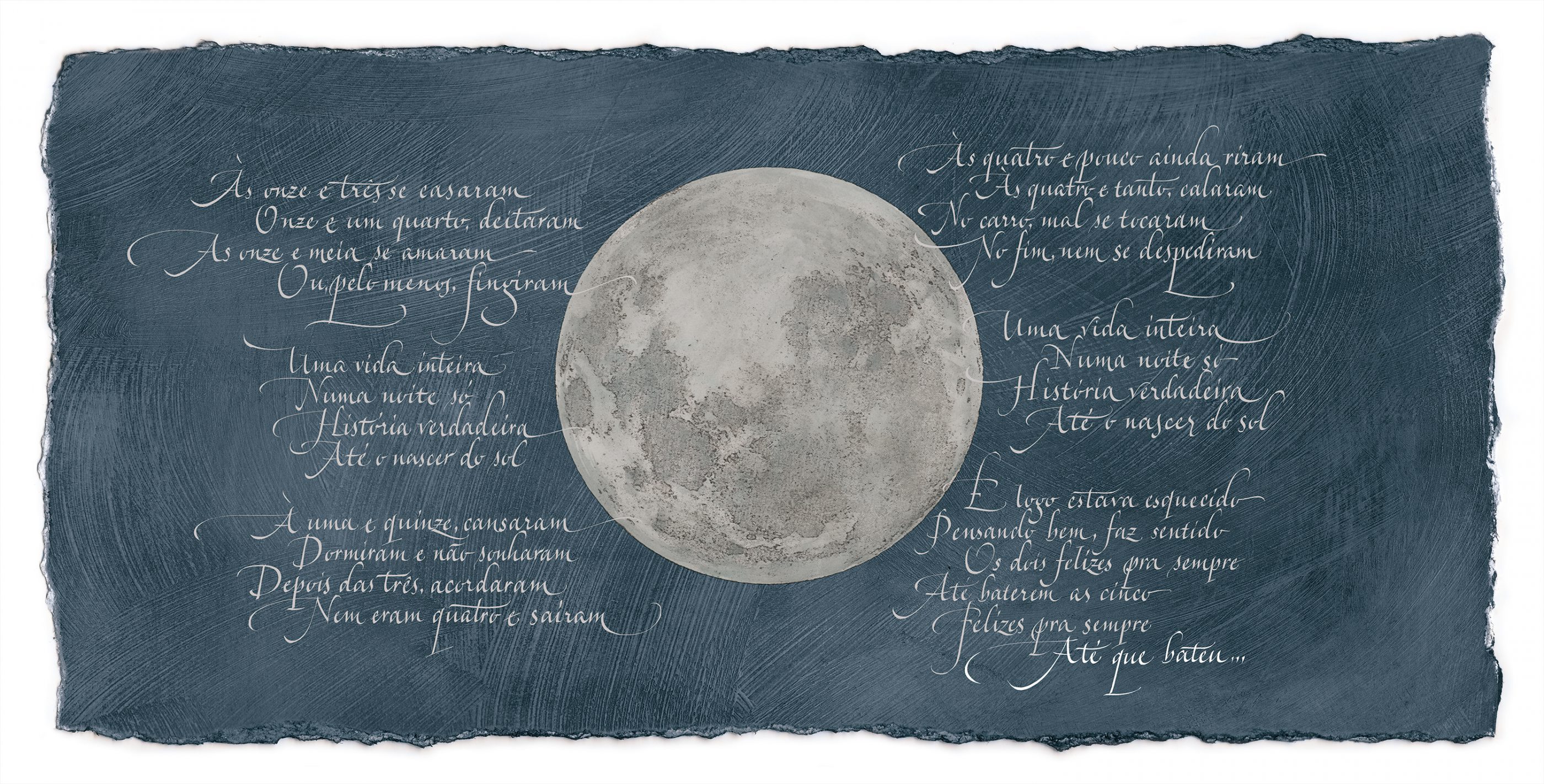 V.M.: Como é um trabalho de natureza mais expressiva, não existe um padrão para o processo de criação. O que fiz inicialmente foi testar diversos estilos de caligrafia para ver qual encaixaria melhor no contexto do trabalho. Fiz estudos de composição do leiaute das páginas, para então fazer as caligrafias finais. Foram caligrafadas várias páginas, e posteriormente selecionadas as melhores. Essas foram então fotografadas e tratadas digitalmente para compor o leiaute desejado. As imagens da lua e do relógio foram feitas pela minha esposa, que trabalha com colagens. Por fim, apliquei texturas, cores e preparei o arquivo de arte-final, utilizando a tinta prata juntamente com as demais, para conseguir um efeito metalizado.