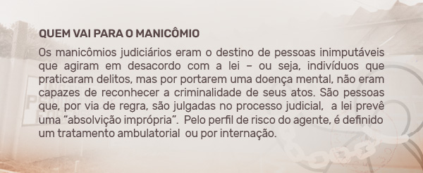 População pobre, ex-escravizados, migrantes e mulheres costumavam ser o perfil desses locais, conforme explica Sandra Fagundes. “Eram recolhidas pessoas que não tinham onde morar e por isso entravam em crise psíquica. Por exemplo, escravos que migravam para as cidades, estrangeiros que não conseguiam se comunicar e mulheres que saiam dos padrões definidos pela sociedade.”