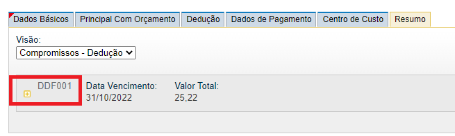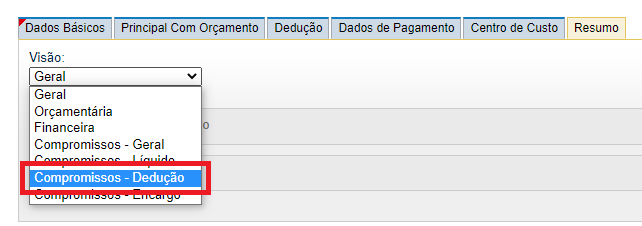 Para se obter informações sobre documentos de dedução, na aba “Resumo”, em “Visão”, escolher a opção “Compromissos – Dedução”: