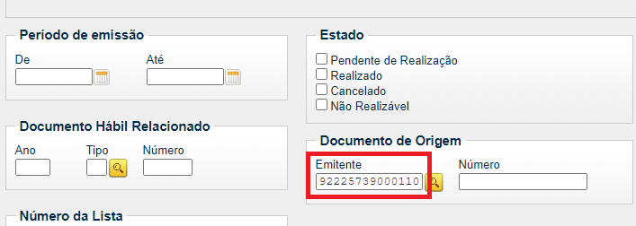 Em “Documento de Origem” no campo “Emitente” digitar o CNPJ da empresa e apertar a tecla “ENTER” no teclado: