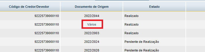 Na coluna “Documento de Origem” pode-se visualizar o número de cada NF, sendo que elas podem estar de forma individual ou agrupadas no link “Vários”: