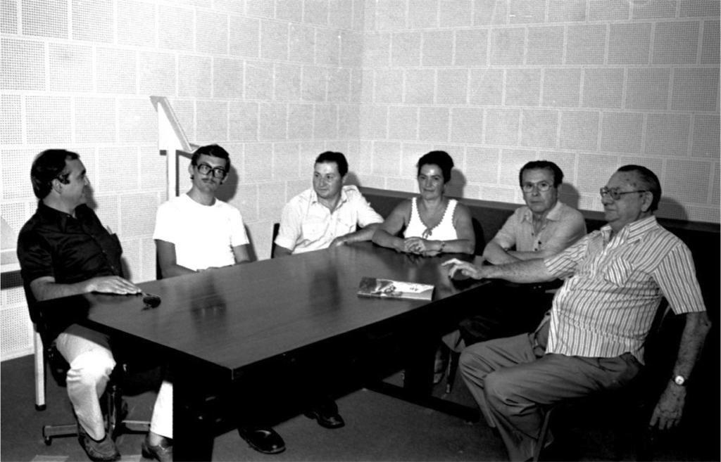Fotografia em preto e branco, em plano geral, de cinco homens e uma mulher sentados ao redor de uma mesa retangular escura. Sobre a mesa, um óculos de sol e um folheto. Ao fundo, parede de revestimento acústico branco e um púlpito.
