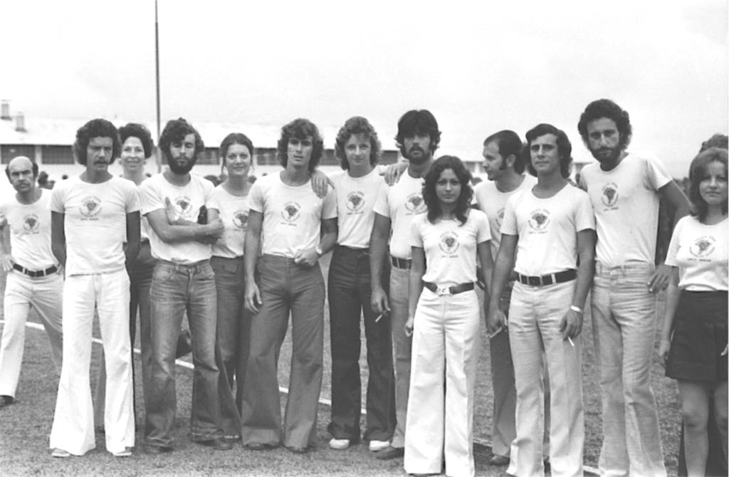 Audiodescrição da imagem: Fotografia em preto e branco de 13 pessoas, lado a lado, de corpo inteiro, próximos a linha branca de um gramado. São nove homens e quatro mulheres. O primeiro está mais atrás e a perna direita a frente. É careca e aparenta ter mais idade que os demais. Olhar sério com as mãos na cintura. Os demais são jovens, cabelos volumosos e ondulados. Todos vestem uma camiseta branca, manga curta, com a logomarca circular do Projeto Rondon no peito. Doze deles usam as camisetas por dentro das calças de cós alto e bocas largas, exceto a última à esquerda, que usa por dentro de uma minissaia com duas pregas e bainha larga. Dois jovens seguram cigarros entre os dedos. Um jovem e uma jovem estão de mãos dadas. Somente uma mulher sorri abertamente, as demais sorriem discretamente. Dois homens sorriem discretamente. Os demais estão sérios. Ao fundo, a fachada de um prédio.