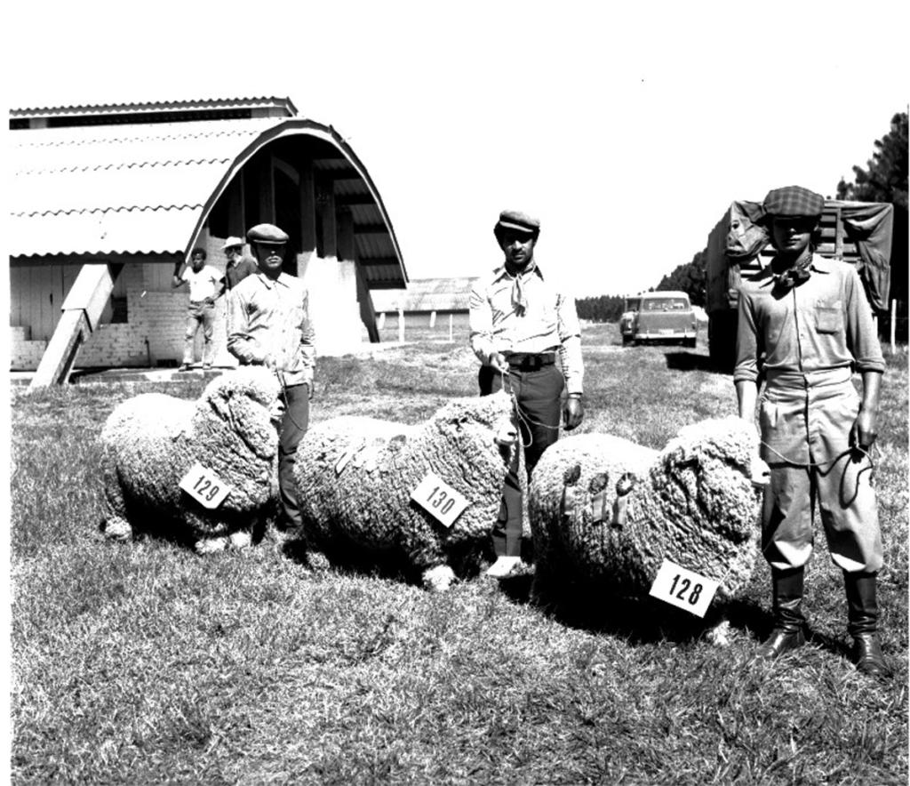 Audiodescrição da imagem: Fotografia quadrada em preto e branco de três ovinos com rosetas de premiação e três homens ao sol. Ao centro, sobre gramado, os ovinos em fila, de perfil, virados à direita, com a lã bem espessa, três rosetas na lateral próximo ao dorso e uma placa acima da pata dianteira com os números 129, 130 e 128 em sequência. Atrás dos ovinos, os homens, de frente, morenos, usam chapéu que sombreia os olhos e cada um segura uma corda presa ao pescoço do ovino. O homem da esquerda, veste jaqueta clara abotoada até o pescoço e calça escura. O do centro, tem bigode, lenço no pescoço, veste camisa clara, calça escura e calçado claro. O da direita, usa lenço, veste camisa com manga dobrada na altura do cotovelo, bombacha clara e botas pretas. Ao fundo, céu claro e, à esquerda, um galpão claro com telhado arredondado, dois homens e outro prédio. À direita, a parte traseira de um carro e de um caminhão com carroceria em madeira e uma lona sobreposta e árvores.