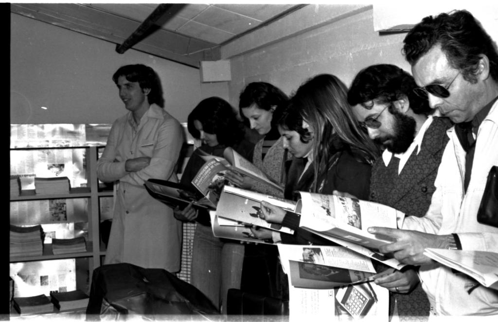 Audiodescrição da imagem: Fotografia horizontal em preto e branco de sete pessoas lendo revistas em um ambiente fechado. As pessoas estão enquadradas do joelho para cima, de perfil esquerdo, e enfileiradas lateralmente, de costas para uma parede, à direita. Destas, seis estão de cabeça baixa, com expressão concentrada, lendo revistas que seguram com os braços ligeiramente dobrados em frente ao corpo. São três homens e quatro mulheres, na faixa etária de 20 a 30 anos. Em primeiro plano, da frente para o fundo, homem de pele clara, alto, com camisa escura, casaco claro de zíper e relógio de metal no pulso esquerdo, segurando embaixo do braço uma carteira retangular e escura. Tem cabelo escuro, ondulado e curto e usa óculos escuros, modelo Ray-Ban. O segundo homem tem pele clara, é mais baixo que o primeiro e usa aliança na mão esquerda. Ele veste um sobretudo escuro, com padrões de círculos sobrepostos e camisa clara; tem barba e cabelo escuros e usa óculos de lentes matizadas. A revista, que segura entreaberta, exibe a fotografia de uma calculadora. Na sequência, as mulheres estão reunidas em um grupo. A primeira tem pele clara, cabelo liso, longo e claro e casaco escuro; a próxima tem a pele clara, cabelo curto e escuro com uma blusa de gola alta clara e blazer escuro; a terceira tem pele clara e cabelo escuro, usando blusa de gola alta com listras horizontais sob casaco claro de lã com calças escuras; e a última mulher tem o cabelo escuro e ondulado, vestindo blusa escura de mangas compridas e calça jeans. Ao fundo, um rapaz alto, com expressão sorridente e braços cruzados em frente ao corpo, que veste uma camisa de gola clara sob um jaleco comprido e claro com três botões fechados. Ele tem pele clara e cabelo escuro e volumoso atrás, no estilo mulet. Na parede, ao fundo, uma estante de madeira, com 3 prateleiras largas contendo pilhas da revista distribuída. O teto é claro, rebaixado e formado por placas retangulares, com uma viga de madeira e um cano escuro que se encontram, perpendicularmente, acima da cabeça do rapaz de jaleco.