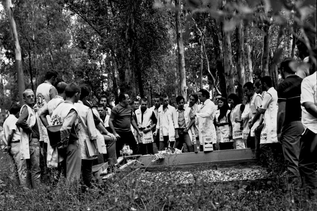 Fotografia horizontal em preto e branco de dois homens adultos e vários estudantes do Curso de Engenharia Florestal em um bosque. Ao centro, os dois homens, de lado para a foto e de frente um para o outro, estando entre eles seis estudantes, com três á frente e três atrás, e os demais a rodear os homens. O homem da esquerda está enquadrado de lado e de frente para o outro homem, com a face  direita visível. Ele é alto, têm a pele parda, cabelo curto e escuro com entradas na lateral, bigode e abdômen proeminente. Veste camisa  escura com duas listas horizontais e finas de tom claro, na parte do peito e na cintura, e calça comprida de tom escuro. Suas pernas estão afastadas, com a esquerda levemente dobrada, e os braços abertos e  levemente dobrados abaixo da cintura. O homem da direita está enquadrado de frente para o primeiro homem, com o perfil esquerdo visível, sendo alto, de pele clara, cabelo liso e cheio, bem penteado, e nariz fino. Veste um jaleco claro de mangas compridas e tem as pernas encobertas por uma lata de lubrificante, da marca “Mobil/Mobilube”, que está ao seu lado. O homem tem o braço esquerdo erguido e dobrado na altura do peito, com a mão fechada e o dedo indicador apontado para baixo,  fazendo sinal para o chão. Em volta dos dois homens estão vários estudantes, cerca de 28 jovens, sendo a maioria do sexo masculino. Eles usam calça comprida e, por cima da roupa, um jaleco sem mangas, com os dizeres “1º Turma UFSM” na frente, e “engenharia florestal” mais o símbolo do curso nas costas. Todos estão em pé e a maior parte seguram pastas, cadernos e livros, com a fisionomia de atenção aos dois homens. Os homens e estudantes estão em um bosque, com bastante galhos secos no chão e, no fundo, várias árvores de tronco fino.