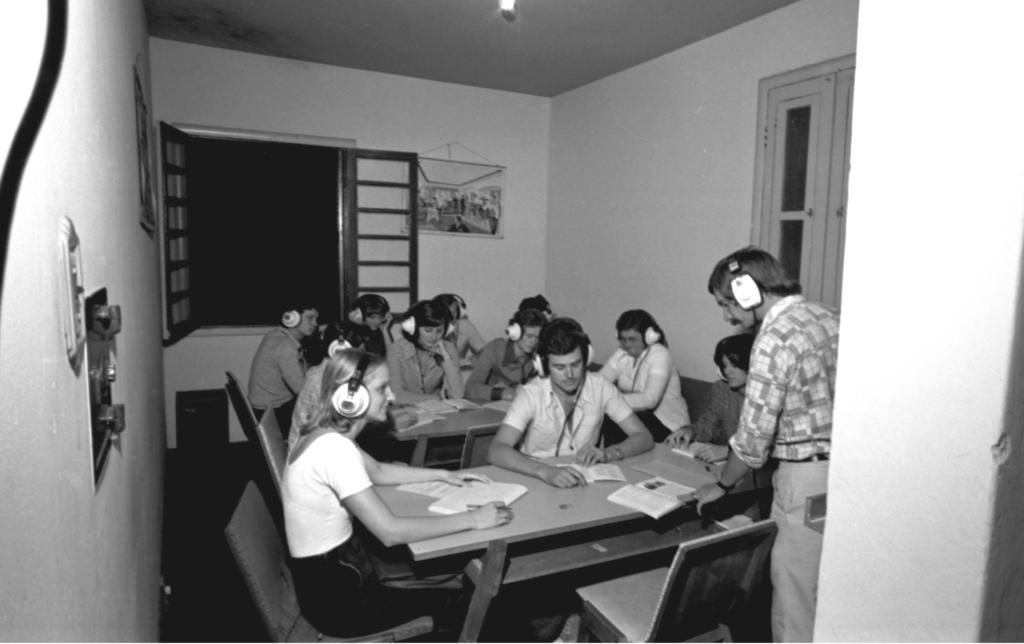 Audiodescrição da imagem: Fotografia horizontal, em preto e branco, plano geral, em que há um grupo de pessoas usando fones de ouvido circoauriculares, e lendo livros, reunidas dentro de uma pequena sala pouco iluminada. São doze pessoas sentadas, sendo a maioria homens, com exceção de um que está em pé; todos de pele clara, cabelo que varia entre o claro e escuro, curto e liso, até o pescoço, ou curto e volumoso, entre vinte e cinco a trinta e cinco anos; vestem roupas casuais: calça jeans, camiseta, camisa xadrez de flanela e uma das mulheres usa casaco com ombreiras. Uma moça sentada à esquerda da fotografia, está virada para o lado direito, com os braços apoiados em cima de um livro e folhas espalhadas sobre uma mesa, sorri. O homem em pé, no canto direito da imagem, olha um livro aberto que está em cima da mesma mesa. O restante do grupo também aparece com livros. A sala tem duas mesas de madeira escura e pernas finas. O grupo está sentado em cadeiras de madeira clara estofadas. Na parede clara, do lado esquerdo da imagem, um disjuntor e um interruptor de luz; ao fundo da sala, uma grande janela quadrada de madeira com duas folhas escancaradas para dentro, em que se vê lá fora um breu; do lado direito da janela, um quadro pendurado, e do lado direito da parede, outra janela de madeira clara, dessa vez vertical, fechada. O teto é claro e de concreto.