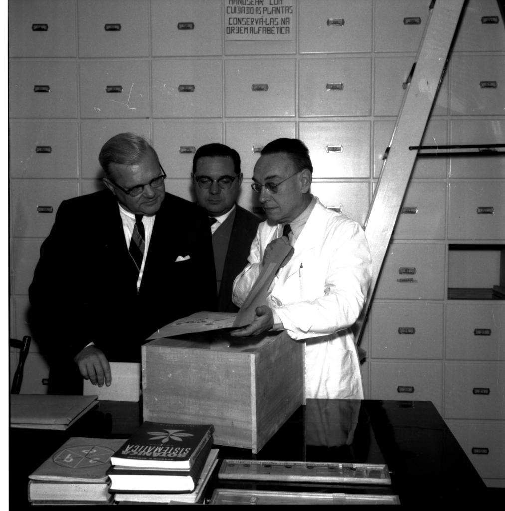 Audiodescrição da imagem: Fotografia vertical em preto e branco de três homens junto à uma mesa com livros e outros objetos, em um ambiente interno, com várias gavetas ao fundo. Os homens, na faixa etária entre 50 e 60 anos, estão enquadrados da cintura para cima, de frente, em pé e lado a lado. Todos têm pele clara, usam óculos de grau com armação redonda e estão com o semblante atento. O homem da esquerda tem o rosto oval, bochechas salientes, cabelo liso, grisalho e penteado para trás, com entradas de calvície na testa, e usa terno de tom escuro, camisa clara e gravata com faixas diagonais em claro e escuro. O homem do meio, de cabelo curto, escuro e penteado da esquerda para a direita, tem rosto oval e veste terno escuro com colete de tom acinzentado, camisa clara e gravata escura. E o homem da direita, de cabelo curto, liso e penteado para trás, tem rosto oval e estreito e veste um jaleco claro, camisa clara e gravata escura. Ele segura, com a mão esquerda, pela lombada, uma pasta de papel cartão, e a abre com a outra mão. E todos os homens olham atentamente para essa pasta. À frente dos homens, uma mesa de tampo escuro sobre a qual estão uma caixa, dois envelopes, cinco livros e dois instrumentos. A caixa, localizada a frente do homem da direita e abaixo da pasta, é de madeira, em tom claro, com a forma quadrada e cerca de quarenta centímetros de altura. À esquerda da caixa, dois envelopes do tamanho A4, em tom claro, deitados um sobre o outro. À frente da caixa e dos envelopes, os cinco livros, em duas pilhas, com três à esquerda e dois à direita. Na capa do livro superior da pilha da direita, a escrita “Botânica Sistemática”, com letras claras em um fundo escuro. Já na capa do livro superior da esquerda, um fundo claro com uma figura em formato de cubo, com as letras “A”, “B” e “C” em suas faces, respectivamente, minúsculas e em tom claro. O cubo está contornado por um círculo de tom escuro. À direita dos livros, dois instrumentos estreitos, compridos e finos, com marcações em toda a superfície superior, similares a uma régua. O fundo está totalmente ocupado por gavetas de arquivo, em tom claro e puxadores metálicos, tendo na extremidade direita um dos espaços vazado, sem a gaveta. Na parte superior e central, a frente de uma gaveta, um cartaz claro, com a escrita em escuro e caixa alta: “MANUSEAR COM CUIDADO AS PLANTAS; CONSERVÁ-LAS NA ORDEM ALFABÉTICA”. À frente das gavetas, na extremidade direita, em frente ao espaço vazado, uma escada metálica de abrir, posicionada lateralmente.