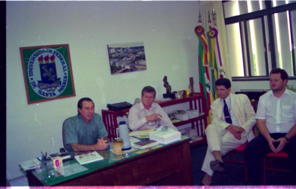 Audiodescrição da imagem: Fotografia horizontal e colorida, de quatro homens sentados em um ambiente interno. Na esquerda da imagem, dois homens, a frente deles uma mesa. O primeiro homem está sentado ao centro da mesa, ele tem cerca de 45 anos, pele branca, cabelo curto, liso e preto, semblante neutro, veste camisa de manga curta em tom azul e tem os antebraços sobre a mesa com as mãos juntas. A esquerda dele e sentado na ponta da mesa, outro homem com cerca de 45 anos, pele branca, cabelo curto, levemente ondulado e castanho escuro, veste camisa em tom de rosa claro, tem pendurado no pescoço um óculos de grau, e está com o cotovelo direito sobre a mesa onde segura na mão uma caneta branca. A direita da imagem, os outros dois homens sentados em cadeiras de madeira com estofamento vermelho, um ao lado do outro. O Terceiro homem, olha para o segundo homem que está à direita dele. Ele tem pele branca, cabelo curto, crespo e preto, semblante neutro, veste camisa branca com listras finas na vertical, gravata em azul escuro com detalhes em dourado, paletó e calça em tom creme e sapato marrom escuro. Usa óculos de grau pendurado no pescoço por um fio escuro, está com as pernas cruzadas, escora o antebraço direito sobre a perna e tem uma mão sobre a outra. A esquerda dele, o quarto homem, também olha com semblante neutro para o segundo homem. Ele tem pele branca, cabelo curto, ondulado e castanho escuro, e barba rala e escura. Veste camisa branca de manga curta e calça jeans escura, usa relógio no punho esquerdo. A mesa é de madeira escura, com tampo verde, sobre ela, uma térmica cinza com detalhes em azul, uma cuia de chimarrão e algumas pilhas pequenas de folhas e pastas. Ao fundo, o encontro de duas paredes. Na parede da esquerda, preso nela, um quadro vertical de fundo verde com o brasão da UFSM. A direita, um quadro horizontal da vista aérea de uma cidade, abaixo do quadro, uma estante de madeira vermelha com três divisórias horizontais e objetos espalhados sobre elas. No encontro das paredes, três mastros com bandeiras do Rio Grande do Sul, Brasil e Universidade Federal de Santa Maria, respectivamente. Na parede da direita, atrás dos mastros, tem uma cortina clara e janelas verticais de vidro. No lado de fora das janelas, há colunas verticais da própria construção que tampam a visão de fora. As paredes são claras e o chão azul escuro.