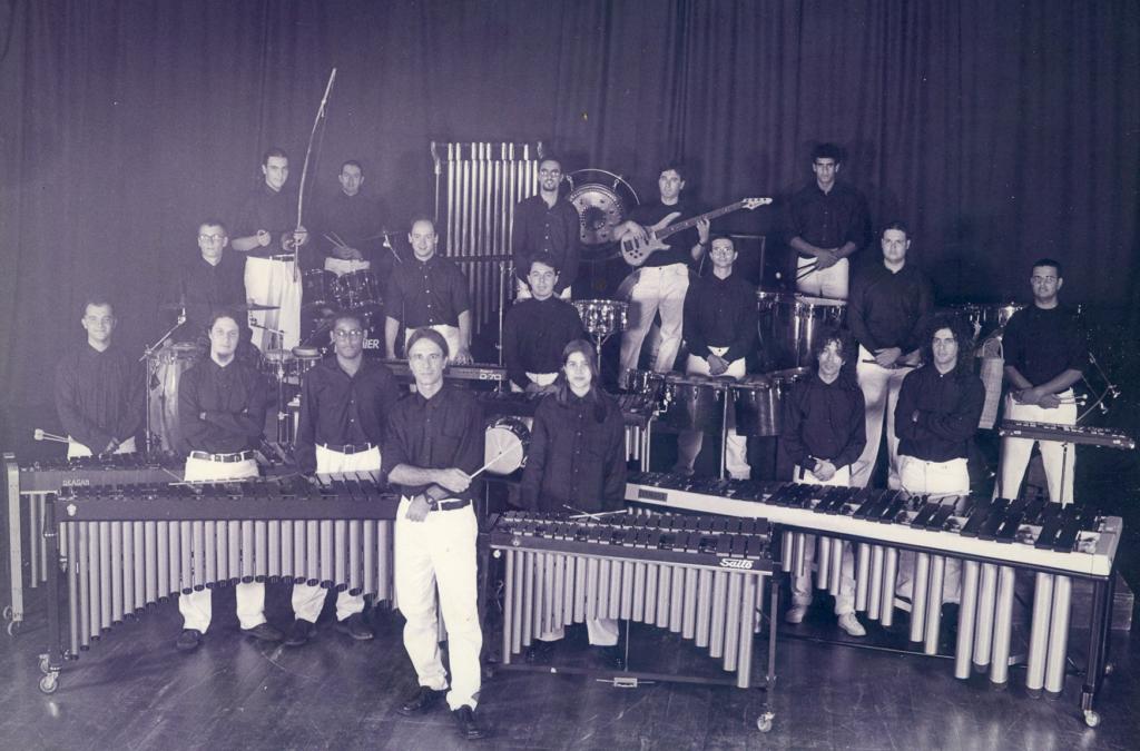 Audiodescrição da imagem: Fotografia em preto e branco, na horizontal, de um grupo de músicos em meio a vários instrumentos, enquadrados de corpo inteiro, em um ambiente interno. Posam para a fotografia, dezoito pessoas em pé e de frente, com seus instrumentos musicais, sobre um estrado. Elas tem cerca de 25 a 40 anos, aproximadamente 1,70 de altura, uma delas é mulher e um pouco mais baixa. O grupo é composto por dezesseis pessoas de pele clara e dois de pele escura, todos têm cabelo escuro; cinco dos homens têm cabelo comprido, dois estão com ele preso e outros dois são mais crespos, um deles usa barba e outro cavanhaque. Apenas três desses homens usam óculos. Toda a banda veste a mesma roupa, camisa escura, calça clara e sapato escuro social. Somente um dos homens usa tênis claro. Cada um dos músicos que compõe a banda traz consigo um instrumento musical ou está em pé atrás dele. Entre os instrumentos temos: bongos, marimbas, berimbau, baixo, teclados, tom-tom e conga. Em primeiro plano, no nível do chão, um homem com os braços cruzados segura uma batuta na mão direita e usa relógio no pulso esquerdo. Nos degraus acima, o restante da banda com seus instrumentos. Ao fundo da imagem, uma grande cortina escura na horizontal. O chão é escuro amadeirado.