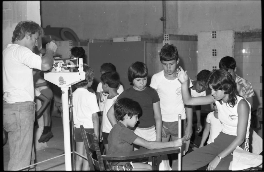 Audiodescrição da imagem: Fotografia horizontal em preto e branco de um grupo de meninos, um homem e uma mulher em um ambiente fechado. São onze meninos de faixa etária entre sete e oito anos, dez deles têm pele clara e um tem pele escura, com cabelos escuros, alguns lisos e outros ondulados. Vestem uniformes esportivos, com camiseta clara de manga curta e short escuro ou vice-versa. À esquerda, uma balança mecânica clara, de ferro, com um menino em pé e de costas sobre ela. À esquerda da balança, o homem, enquadrado dos joelhos para cima, de costas, levemente voltado para a direita. Tem aproximadamente trinta e cinco anos, pele e cabelos claros. Veste camiseta e calça jeans claras. Está com a mão direita em direção à balança. À direita da balança, um menino sentado em uma cadeira de madeira escura. Está de perfil direito e segura um bastão de ferro claro. Em frente a ele, a mulher. Ela está sentada de frente para nós, mas com o rosto voltado para o menino. Tem aproximadamente vinte e oito anos, pele clara, cabelo liso, curto e escuro. Veste regata branca e calça escura com quatro listras claras na lateral da perna. Usa uma pulseira de metal no punho esquerdo e está com a mão direita levantada em direção ao menino. Ao fundo, entre o homem e a balança, vê-se um menino que pula e está enquadrado somente da cintura até os pés e usa meias e tênis escuros. Os outros meninos estão dispersos no ambiente. Riem e interagem entre si. Ao fundo, uma parede clara, com a metade inferior revestida de azulejos quadrados. Perpendicular a ela, divisórias feitas de tijolos aparentes pintados de cor clara, de aproximadamente um metro e meio de largura e um metro e meio de altura, limitam aproximadamente cinco box. O chão é de cimento claro.