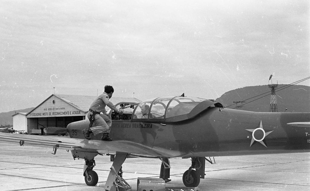 Audiodescrição da imagem: Fotografia, horizontal, em preto e branco, de uma aeronave com um homem dentro e outro sobre a asa, em um pátio de estacionamento. No primeiro plano e na diagonal, visível parte da fuselagem lateral do avião de pequeno porte, que é acinzentado com algumas manchas mais escuras. O avião está com o canopi de vidro e trem de pouso abertos. Dentro do canopi, um homem com cerca de 40 anos, sentado, tem pele clara, cabelo curto, liso e escuro. Em cima da asa esquerda do avião, outro homem levemente agachado, tem pele escura, cabelo levemente curto, liso e escuro, veste roupa acinzentada, cinto, coldre e coturno escuro, e olha para o homem sentado dentro do avião. Próximo a hélice, o número “35”, abaixo do canopi e próximo a asa, a frase “força aérea brasileira”. No fundo e à esquerda, um hangar claro, com a escrita escura, na frente: “4º esquadrão misto de reconhecimento e ataque”. Dentro, caixas grandes de madeira. Ao lado esquerdo do hangar, um pavilhão claro e próximo a ele, outro avião escuro. À direita, atrás da calda do avião, visível uma torre escura com uma parte clara, no topo, uma biruta escura. Após a torre, dois fios de luz escuros. E distante, uma montanha escura. Céu claro e chão de cimento claro.