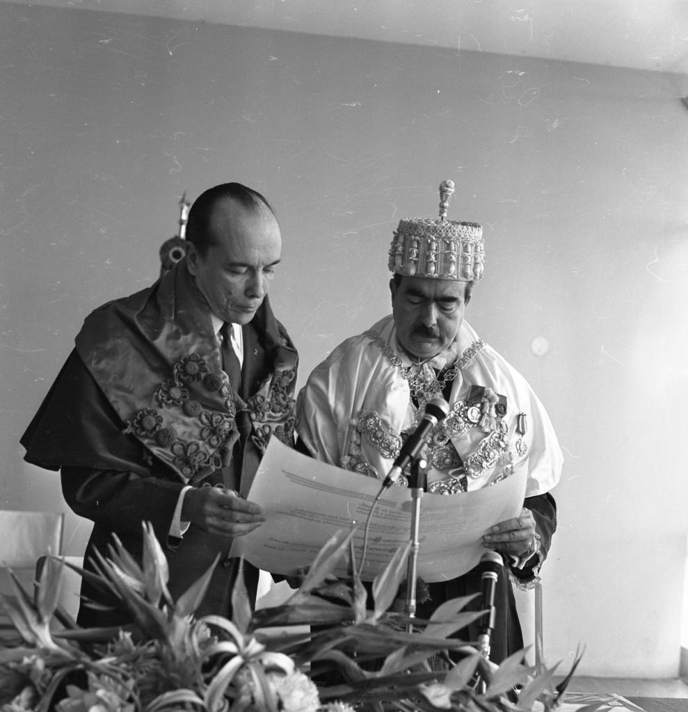Audiodescrição da imagem: Fotografia quadrada, em preto e branco, de dois homens, um ao lado do outro, segurando e olhando para um cartaz claro em um ambiente interno. O homem da esquerda, enquadrado da cintura para cima, está de frente e o rosto levemente voltado a direita, tem cerca de 50 anos, semblante neutro, pele clara, cabelo curto, liso com entradas de calvície e escuro. Veste samarra escura que é um tecido usado sobre os ombros e fechado na frente, com alguns detalhes bordados, em baixo, paletó e gravata escuros. Segura com a mão direita a lateral do cartaz. A direita do homem, o Reitor José Mariano da Rocha Filho, enquadrado da cintura para cima e de frente, tem o semblante neutro e olha para baixo, tem cabelo liso e escuro, e bigode farto. Veste capelo claro, beca escura, samarra clara com detalhes em bordado e colar reitoral. Segura com a mão esquerda, a outra lateral do cartaz. O cartaz é claro e horizontal, visível a sombra da escrita escura. À frente deles, alguns ramos de folhagens pequenas, dois microfones escuros fixos em suportes metálicos. Ao fundo, parede clara com o lado direito iluminado por uma luz. A esquerda e junto a parede, encosto claro de uma cadeira. Teto claro.