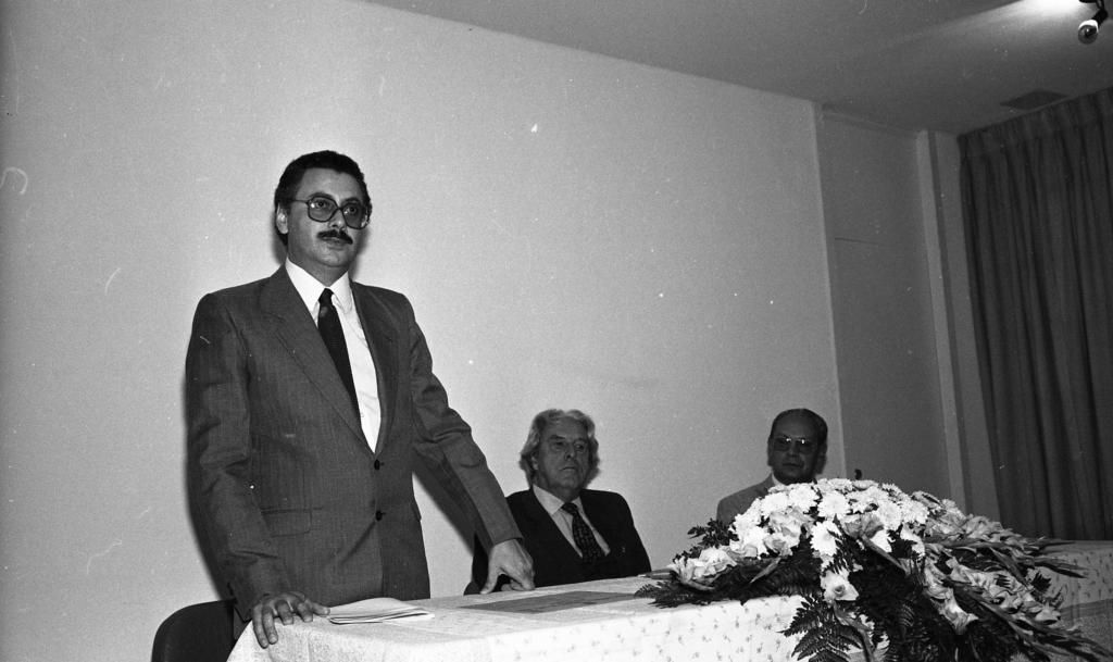 Audiodescrição da imagem: Fotografia horizontal, em preto e branco, enquadrada da esquerda para a direita, de três homens atrás de uma mesa. Os três homens estão de frente, têm faixa etária entre cinquenta e sessenta anos e pele clara. O primeiro homem está em pé, enquadrado da cintura para cima, voltado levemente para a direita. Tem cabelos curtos e escuros e bigode escuro. Veste um paletó e uma gravata escura. Usa óculos de grau com armação redonda e escura. Atrás dele, o encosto estofado e escuro de uma cadeira. O segundo homem está sentado. Tem cabelos lisos e grisalhos e veste paletó e gravata escuros e têm expressão mais séria. O terceiro homem também está sentado. É calvo, veste paletó claro e usa óculos de grau com armação redonda e escura. A mesa é retangular e está coberta por uma toalha clara e estampada. Sobre ela algumas folhas de papel e, ao centro, um arranjo de rosas claras e ramos de folhas que encobre parcialmente o terceiro homem. Ao fundo, parede clara com uma porta clara. Na lateral direita, uma parede está encoberta por uma cortina escura. No canto superior direito, uma parte do teto claro com uma lâmpada.