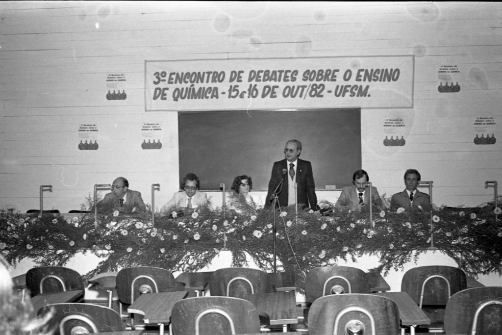 Audiodescrição da imagem: Fotografia horizontal, em preto e branco, ambiente fechado, ao centro um homem em pé, em frente a um microfone, ao seu redor quatro homens e uma mulher sentados, todos posicionados atrás de uma mesa. Ao centro da imagem, um senhor em pé, posicionado atrás de uma mesa retangular e cumprida, com um microfone fixado sobre a mesa a sua frente, enquadrado da cintura para cima, perfil direito levemente voltado para a esquerda, mãos apoiadas sobre a mesa, é calvo, cabelo ralo e liso, pele clara, usa óculos, veste terno escuro, por baixo camisa branca de gola fechada, e sobre ela um cardigan de botões e gola “V” profunda, em tom claro, gravata escura. A esquerda do homem, uma mulher e dois homens sentados, na ponta esquerda da mesa um senhor enquadrado do peito para cima, é calvo, cabelo escuro, usa óculos, nariz fino e cumprido, boca pequena, orelhas grandes, veste terno escuro, por baixo camisa branca de gola fechada, gravata escura, os antebraços estão sobre a mesa. A sua direita um homem enquadrado do peito para cima, tem cabelo cheio, escuro, com entradas na testa, usa óculos, veste terno claro, por baixo camisa branca de gola fechada, gravata clara, os antebraços estão sobre a mesa e as mãos estão cruzadas, olha para frente. A sua direita uma mulher sentada, tem cabelo volumoso escuro, usa óculos, veste roupa clara, está com a cabeça voltada para a direita. A sua direita o homem ao microfone, a direita dele um homem sentado, cabelo liso, escuro, com entradas na testa, bigode escuro, veste terno também escuro, por baixo camisa branca de gola fechada, gravata escura, olha para baixo em direção a mesa, tem os antebraços sobre a mesa. A sua direita um homem sentado em posição ereta, olha para frente, tem cabelo volumoso, escuro, olhos e boca pequenos, veste jaqueta escura, camisa de gola branca fechada, gravata escura. Na parte inferior da imagem, nove cadeiras universitárias, enfileiradas uma ao lado da outra, em duas filas, as cadeiras tem prancheta fixa, de madeira em fórmica, escuras, todas estão vazias, a frente das cadeiras uma mesa retangular cumprida, coberta por um arranjo de ramos e flores em toda a sua extensão, atrás da mesa as pessoas descritas. Ao fundo, parede branca, ao centro um quadro negro retangular, na parte inferior do quadro ao lado direito um apagador, na parte superior uma faixa extensa escrita em tons escuros e em letras de forma maiúsculas, na primeira linha, terceiro, em numeral, encontro de debates sobre o ensino, na segunda linha, de química, traço, quinze e dezesseis, em numeral, de outubro, abreviado, travessão, oitenta e dois, em numeral, traço UFSM, ponto. Ao redor do quadro negro, seis cartazes, todos iguais, fixados na parede, três do lado esquerdo, um bem acima e outros dois abaixo, os outros três do lado direito, na mesma disposição que os da esquerda. Os cartazes na vertical com fundo claro, letras em tom escuro, escrito terceiro, em numeral, encontro de debates sobre o ensino de química, na parte inferior do cartaz, quatro figuras de garrafas de ensaio em tom escuro.